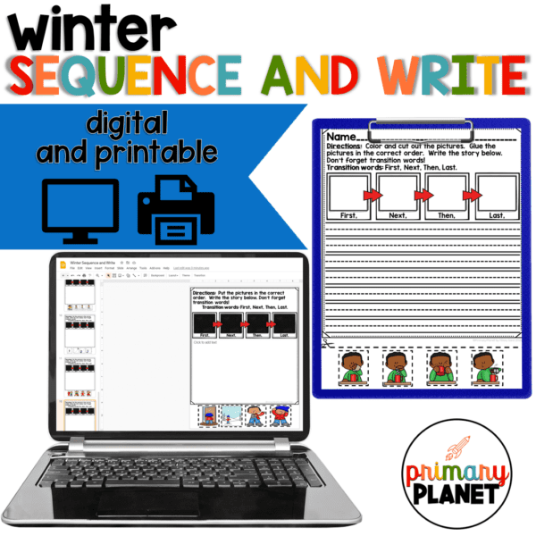 Teaching Story Sequencing? These fun story sequence writing worksheets with pictures are a fun way to teach procedural writing! These fun Winter sequence writing worksheets include both printable and digital pages!